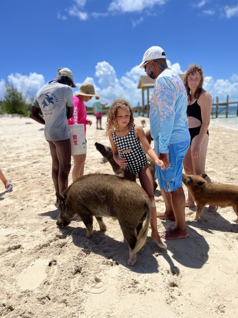 Our last stop, we anchored at “No Name Cay,” to swim with the hogs. We fed the hogs bread along the beach. After a few minutes, I let down my guard—they were pigs after all. Bella left my side and meandered to the edge of the water. I saw the largest male turn and single her out. He started towards her, and she extended her arm inviting him in. For a moment, I glanced away and then looked back just in time to see it charge. It thrust its head into her outer thigh and jerked before running away, leaving my daughter screaming and bleeding with a huge chunk missing from her thigh. It happened so fast. It took a few seconds to realize the severity.